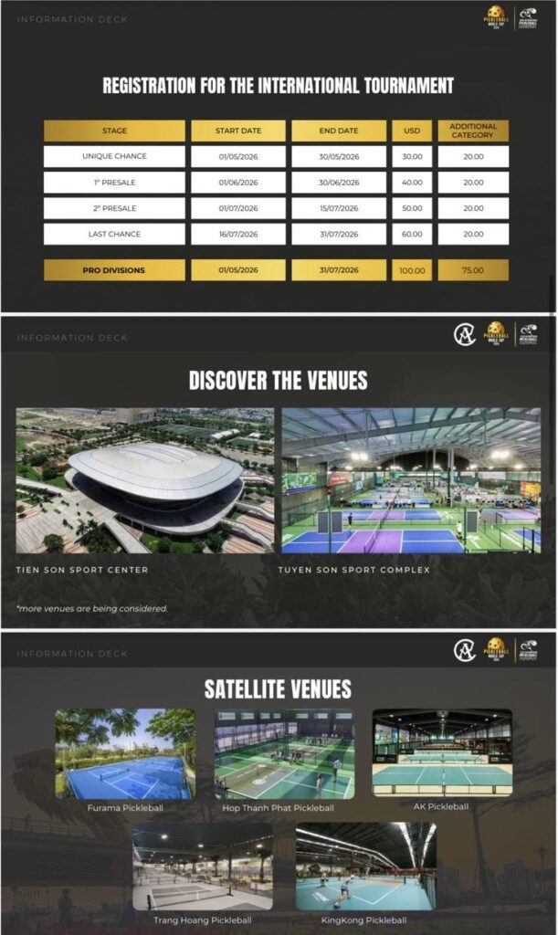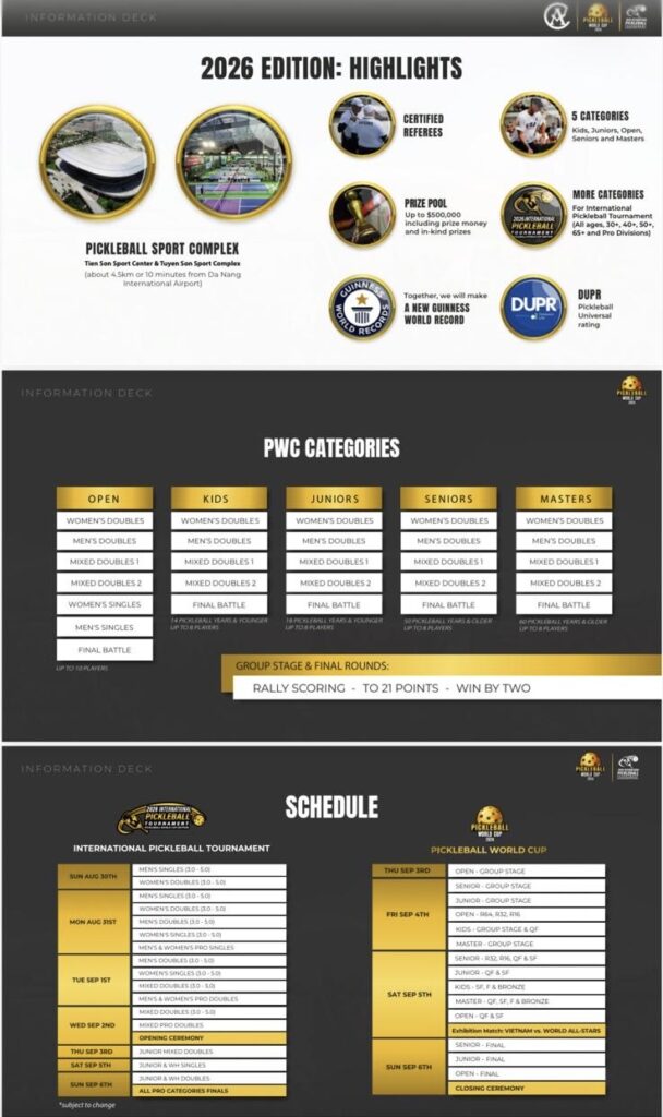 Pickleball World Cup 2026 bude probíhat 30.8.-6.9. ve Vietnamu. Da Nang bude tento rok hostitelské město po Peru a Fort Lauderdale. Vietnam je nyní beze sporu zemí, kde pickleball roste obrovskou rychlostí. Pickleball World Cup bude jako vždy začínat International Tournament, který je otevřený pro všechny hráče a poté bude následovat samotný týmový World Cup, tentokrát v 5 kategoriích a to :